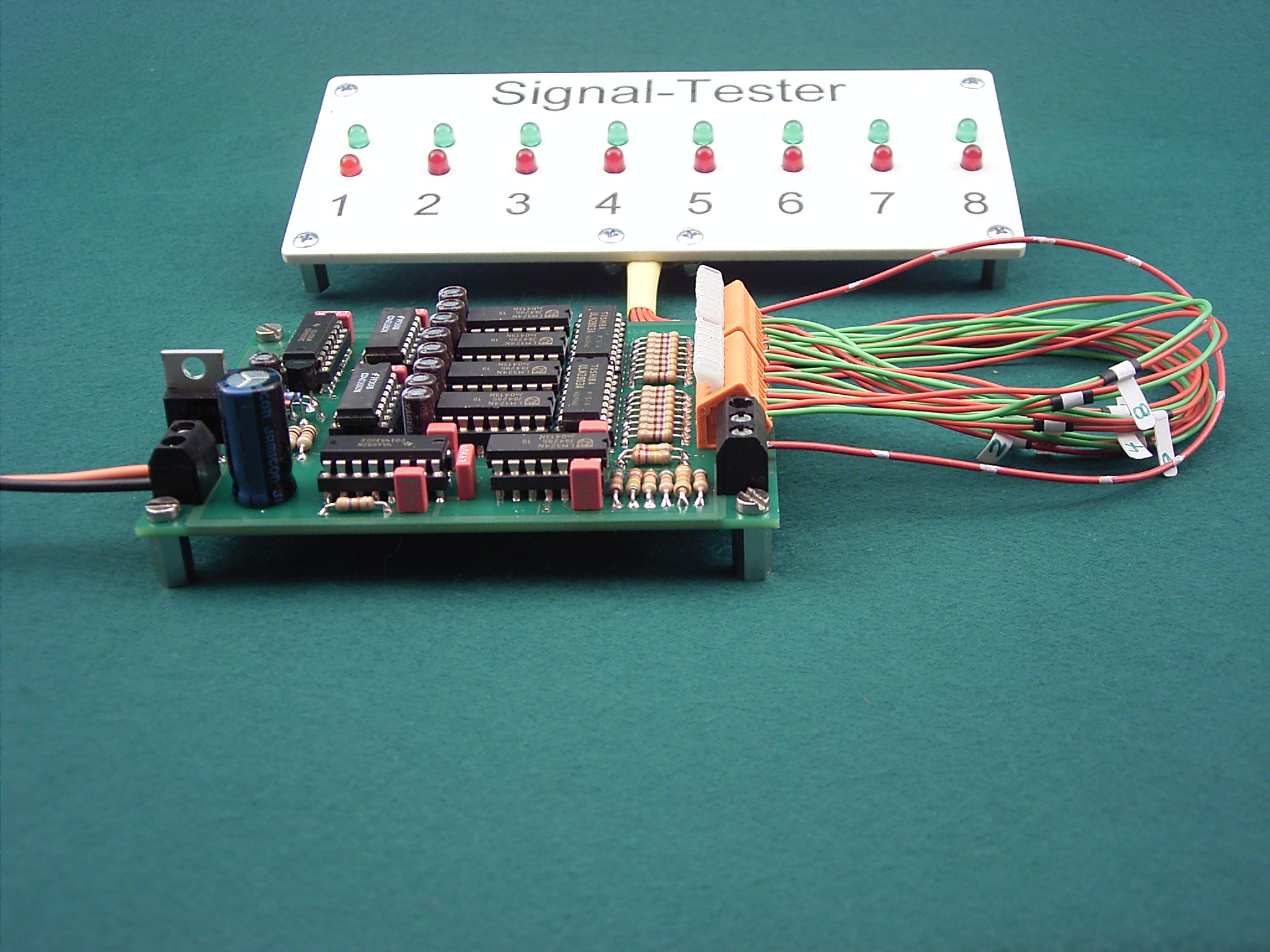 Diese Platinen kann an die Seriell-Sender-Platine angeschlossen werden und erlaubt die Ansteuerung von bis zu 8 Lichtsignalen. Dabei genügen 2 Adern von der Sender-Platine zu dieser Platine. Über diese beiden Kabel wird sowohl der Betriebsstrom für LED-bestückte Signale wie auch die Information zum Signalbild übertragen. Damit kann man den Verdrahtungsaufwand gegenüber der normalen Signalplatine wesentlich verringern. Darüberhinaus erfolgt der Lichtwechsel nicht schlagartig sondern, ähnlich dem Vorbild, gleitend.